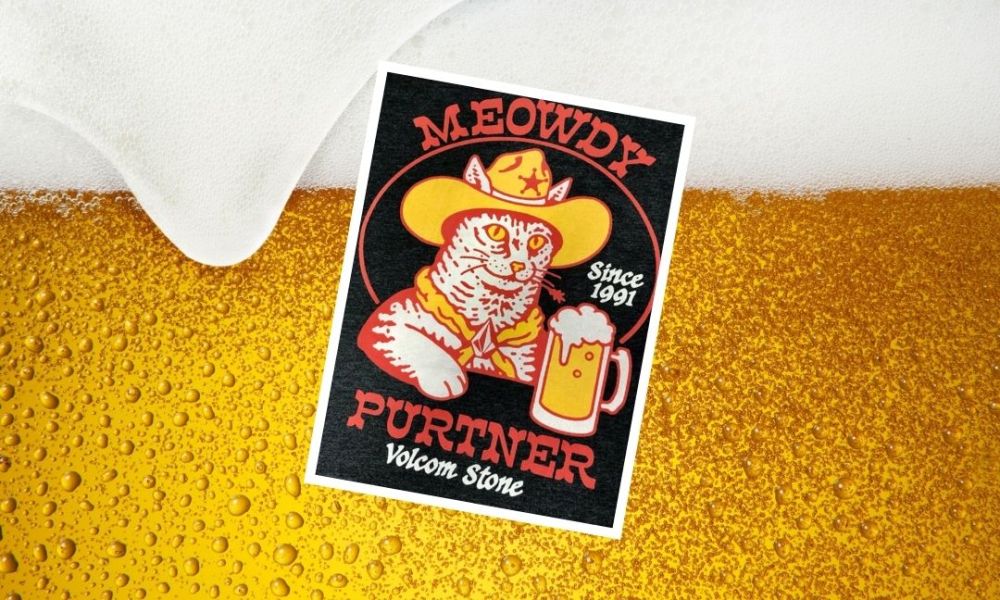 Ten nápis Meowdy Purrtner je přesně ten typ slovní hříčky, která by v horším provedení bolela. Tady drží. Sedí k tomu klobouku, půllitru i tomu klasickýmu Volcom Stone podpisu dole.