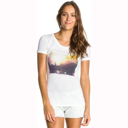 Na hrudi je výrazný potisk zapadajícího slunce nad městem a logem značky Roxy.